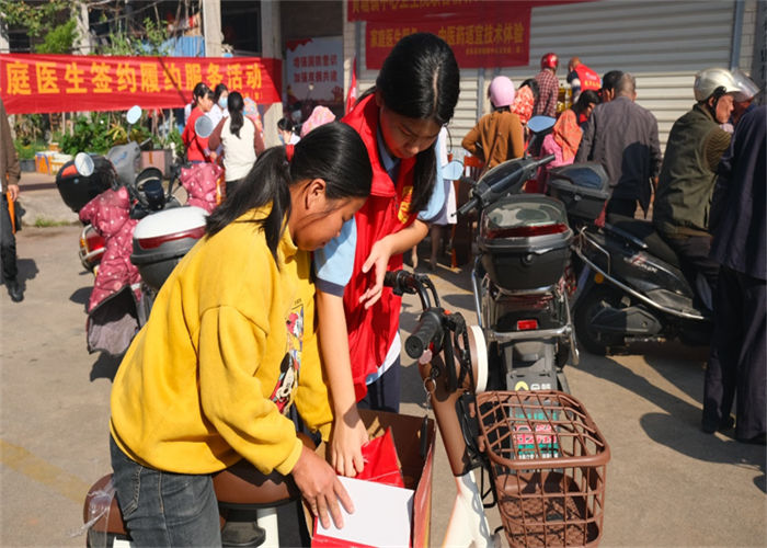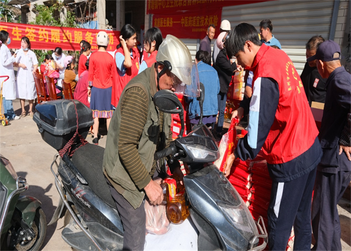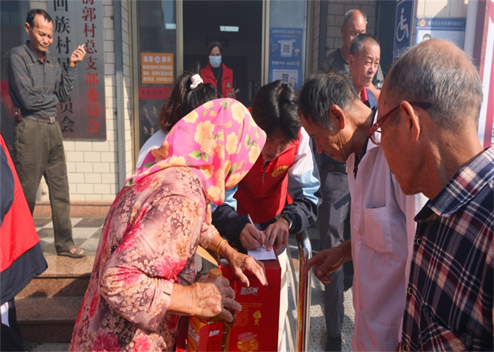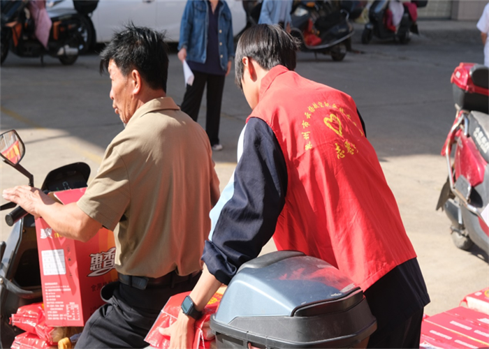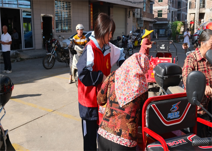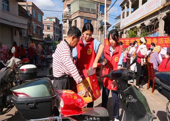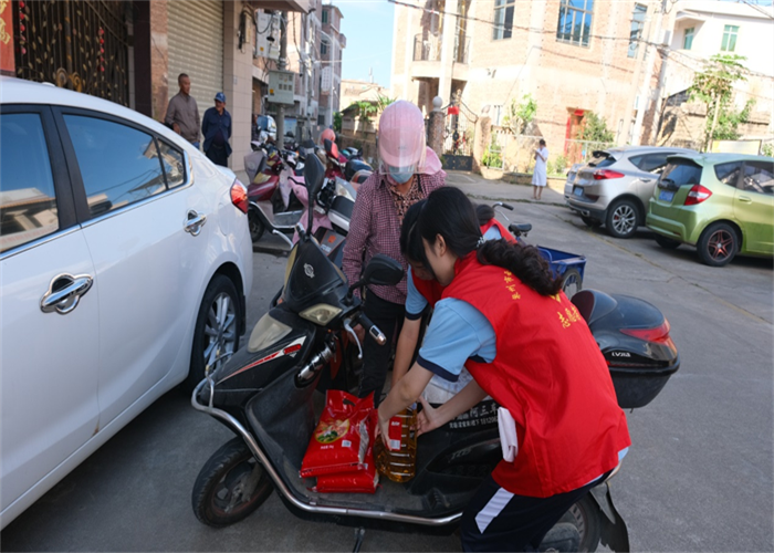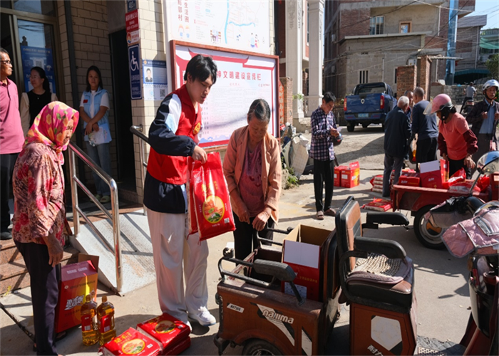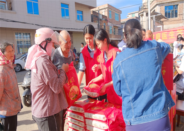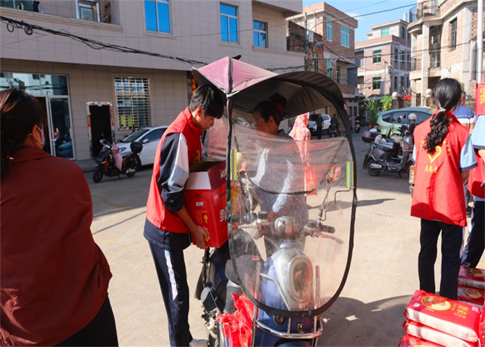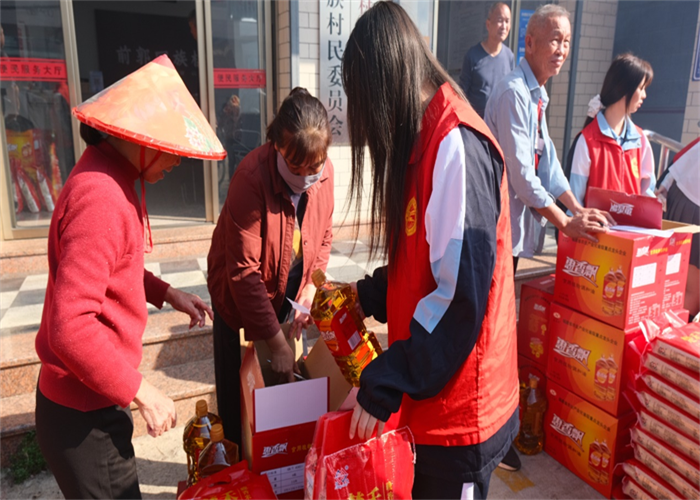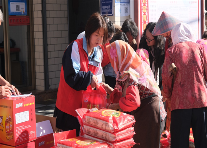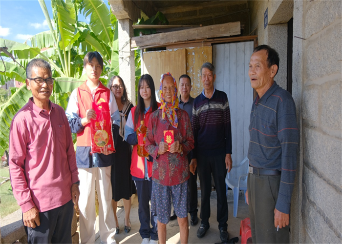 前郭村委會廣場上早已人聲鼎沸,舞蹈與煙花交織出濃濃的節(jié)日氣氛。人群中,我校志愿者們的身影格外醒目。他們俯身與老人交談,細(xì)心遞上物品,認(rèn)真傾聽他們的家常,關(guān)切詢問健康狀況與生活起居,將青年一代的敬意與關(guān)懷,化作一句句溫暖問候,傳遞到每位老人心中。