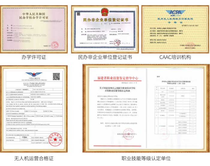 學(xué)校是經(jīng)福建省職業(yè)技能鑒定指導(dǎo)中心備案的具有職業(yè)技能等級(jí)認(rèn)定資格的學(xué)校,具備開展無人機(jī)駕駛員等職業(yè)的技能培訓(xùn)與等級(jí)認(rèn)定能力。同時(shí),具備中國(guó)民用航空局(CAAC)批準(zhǔn)具備民用無人駕駛航空器運(yùn)營(yíng)資質(zhì),取得中國(guó)AOPA認(rèn)證的民用無人機(jī)駕駛員訓(xùn)練機(jī)構(gòu)合格證。