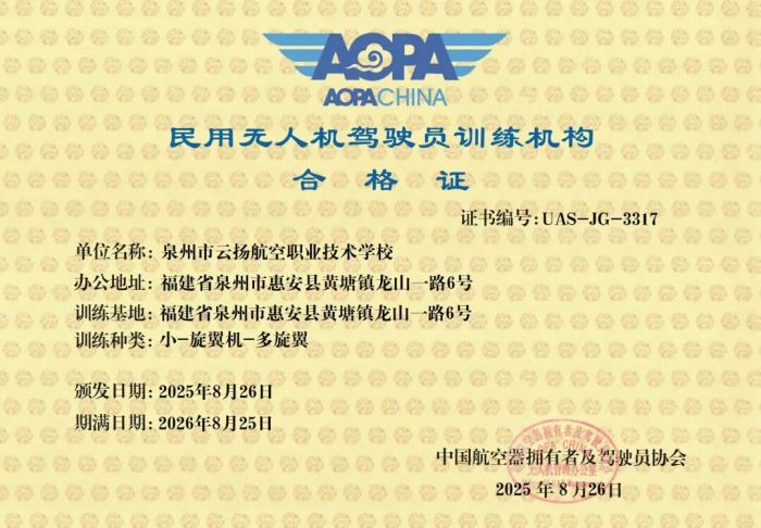 8月26日,我校成功取得由中國(guó)航空器擁有者及駕駛員協(xié)會(huì)(AOPA)頒發(fā)的“民用無人機(jī)駕駛員訓(xùn)練機(jī)構(gòu)合格證”,正式成為中國(guó)民航局(CAAC)認(rèn)證的民用無人機(jī)駕駛員訓(xùn)練機(jī)構(gòu)。