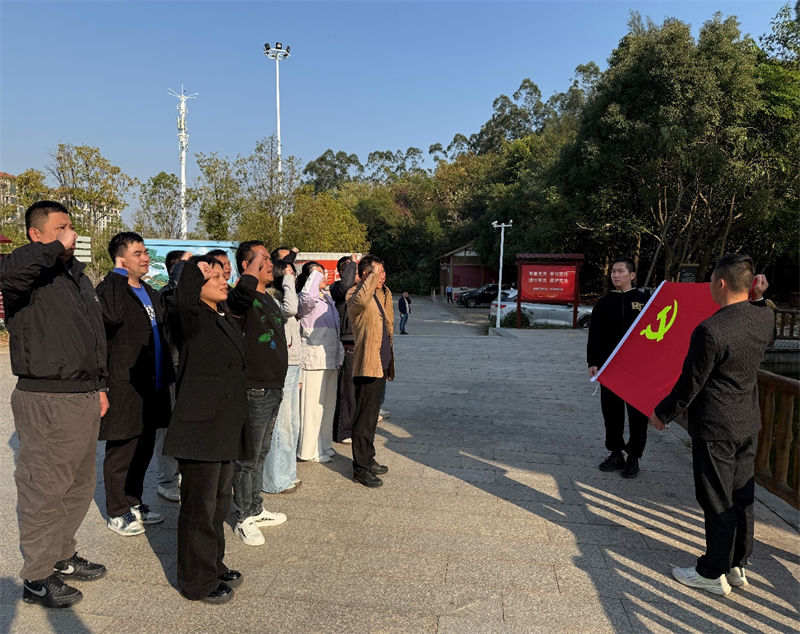 展廳內(nèi),泛黃的文獻、珍貴的實物,將那段烽火歲月具象為可觸可感的記憶。黨員同志們駐足凝視,仿佛聽見歷史的回響。面對鮮紅黨旗,在黨支部書記潘向東同志的領(lǐng)誓下,全體黨員重溫入黨誓詞,堅定有力的誓言在紀念園上空回蕩,詮釋著教育工作者為黨育人、為國育才的初心使命。