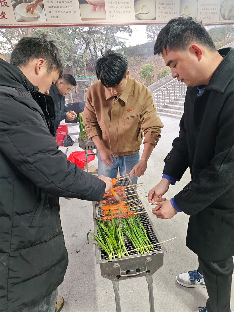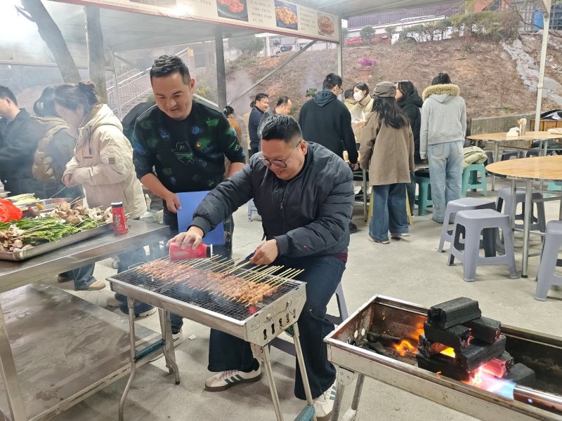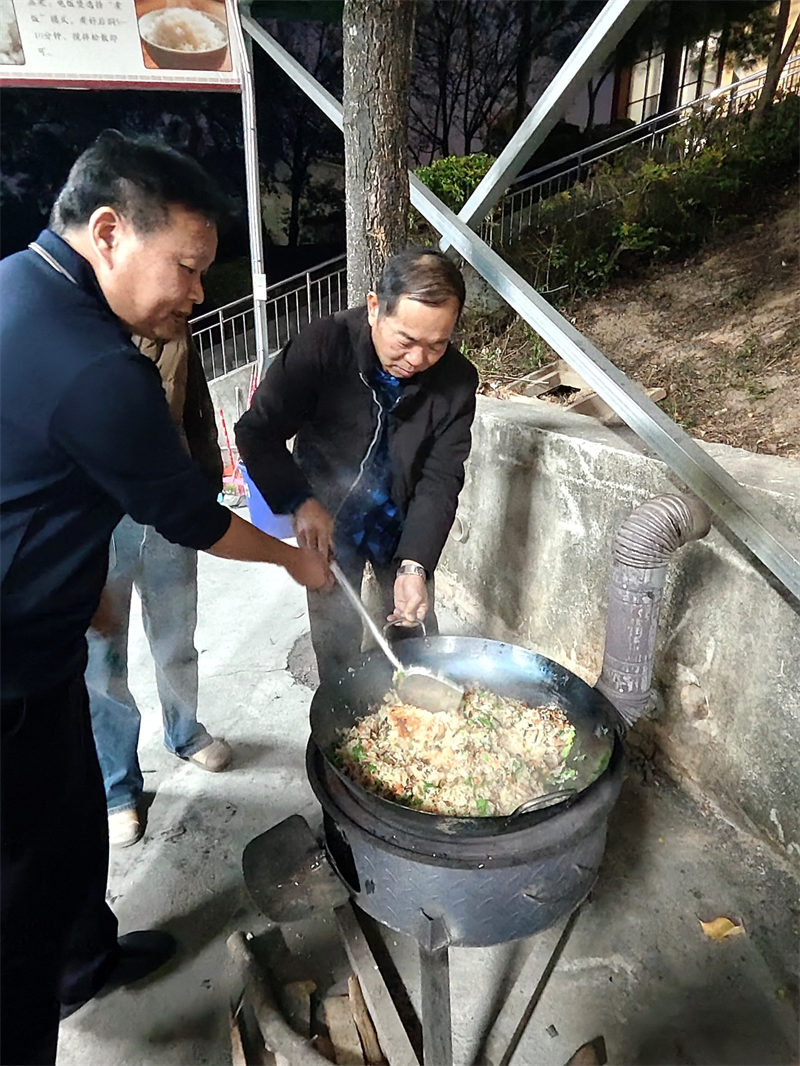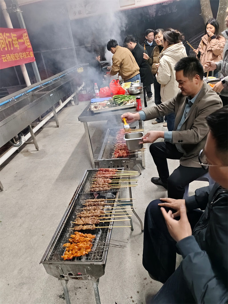 日影西斜,炊煙裊裊升起。各小組分工協(xié)作,有的生火備料,有的掌勺烹調(diào)。燒烤架上滋滋作響,大鍋灶里熱氣蒸騰,老師們在鍋碗瓢盆的協(xié)奏中交流廚藝、分享心得,尋常食材在協(xié)作中化作美味佳肴。